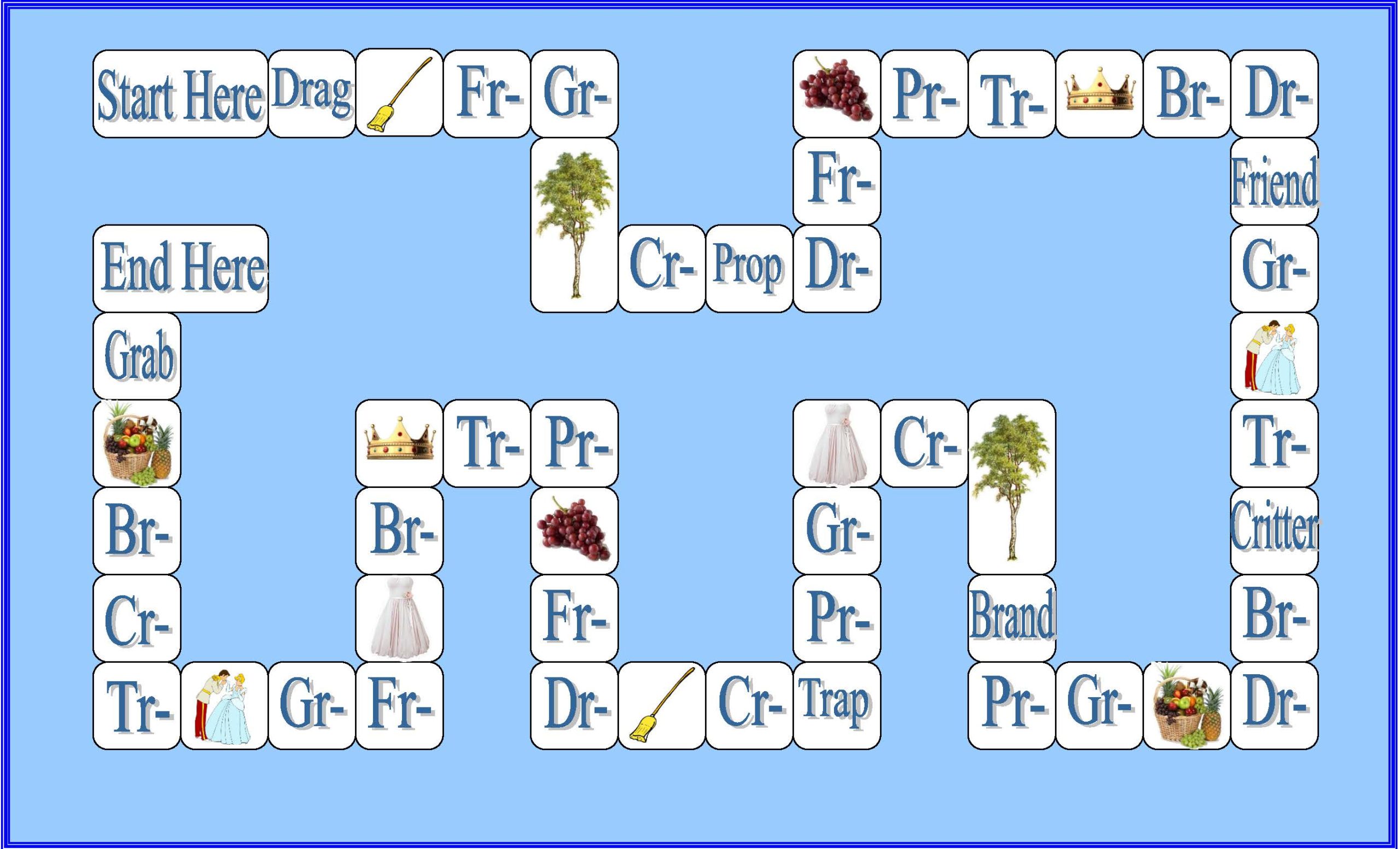 For the game boards that use cards, I again fill in the boxes with either sample words or target graphemes or phonemes. Then students draw a card and move to the next closest example of the word. If they draw rain, for instance, they may move to pail or ai or ā. Warning (based on experience!): don’t include any boxes with only “move forward” or the like, because students will never hit them! One way to accommodate this is that if they happen to land on the same word they drew, they get to go again, or put fun actions on boxes with sample words or target graphemes or phonemes.