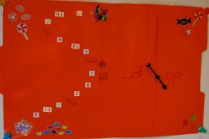 The next simplest game is best for differentiating between two, three or four word families. I use colored file folders for this type as well, but I keep them whole. On one side of the file is another path of starting consonants going up from start to finish. On the other side is a spinner. Somehow, punching a hole through the file folder and inserting a plastic spinner, while incredibly easy, seems incredibly fancy and cool. Around the spinner, I draw in the word families I want the kids to work on. Towards the beginning, they may be very similar, like _op and _ot, or they may be more complicated, like _ing, _ang, _ung and _ong. Again, you flip the coin to move forward on the path, and then spin the spinner to make a word. It is harder to make sure each combination makes a word, so you can either play that it is ok to write nonsense words, or that you get to choose an ending that makes a word, or that if you can’t make a word, you lose that point. Also, of course, be careful to check and double-check all the word combinations, especially the dangerous endings like _it and _uck.
